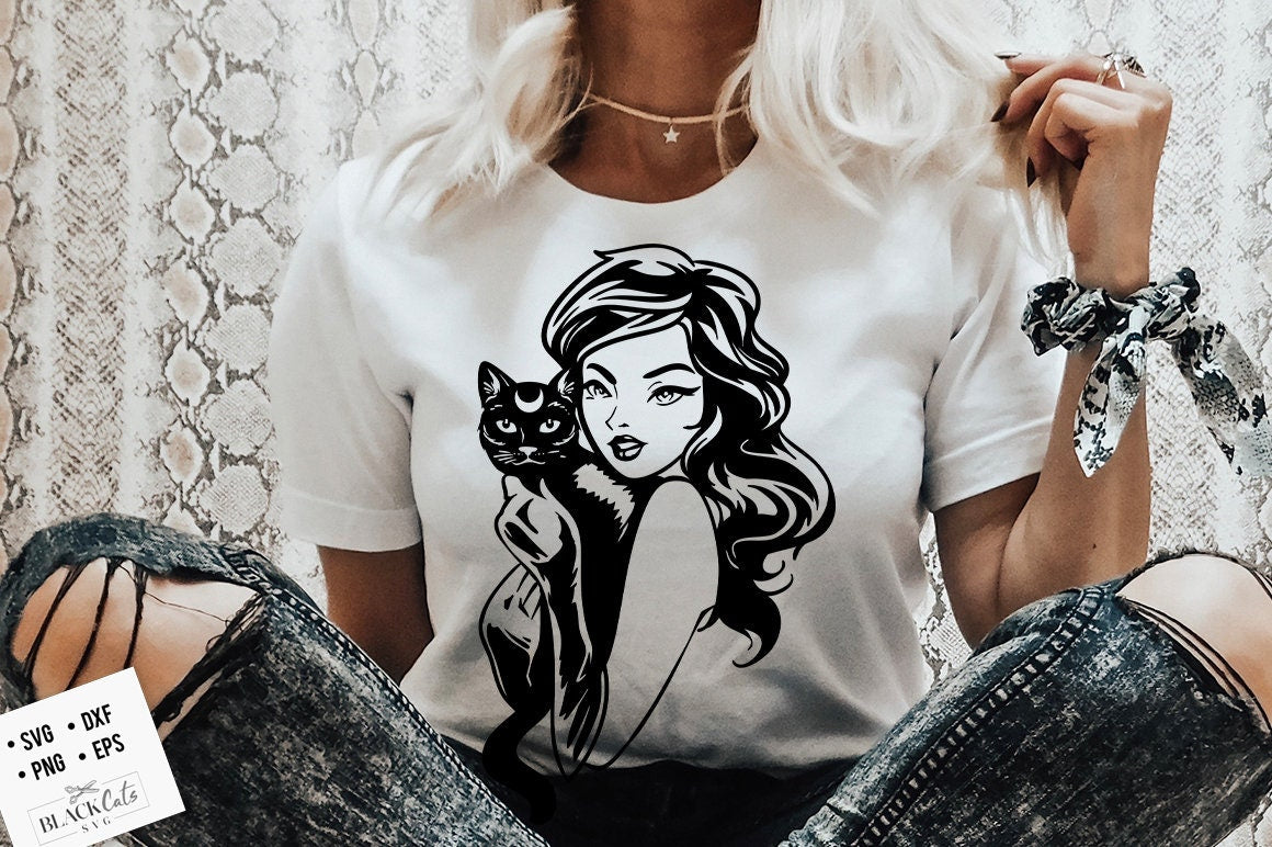 Girl and Black cat SVG, Girl and cat svg, Magic illustration svg, Witchcraft svg, Boho svg, Boho illustration svg, Magic Illustration svg